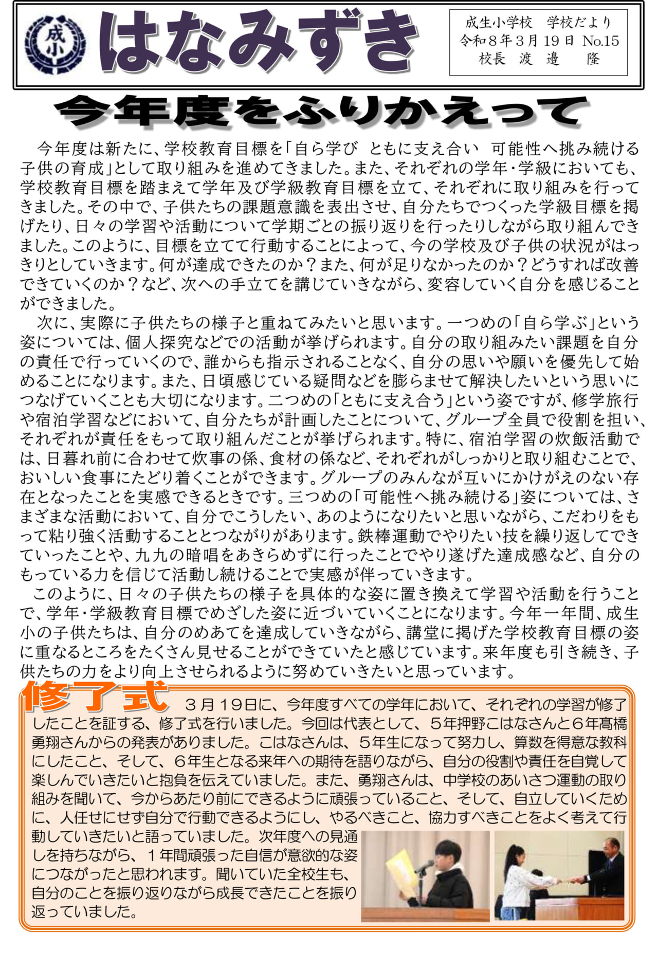 3月19日(木)に、今年度の学習をすべて修了したことを証する修了式を行いました。今回代表として、作文の発表と修了証授与を、5年生押野こはなさん、6年生髙橋勇翔さんが行いました。こはなさんは、5年生になって努力し、算数を得 … “修了式” の続きを読む