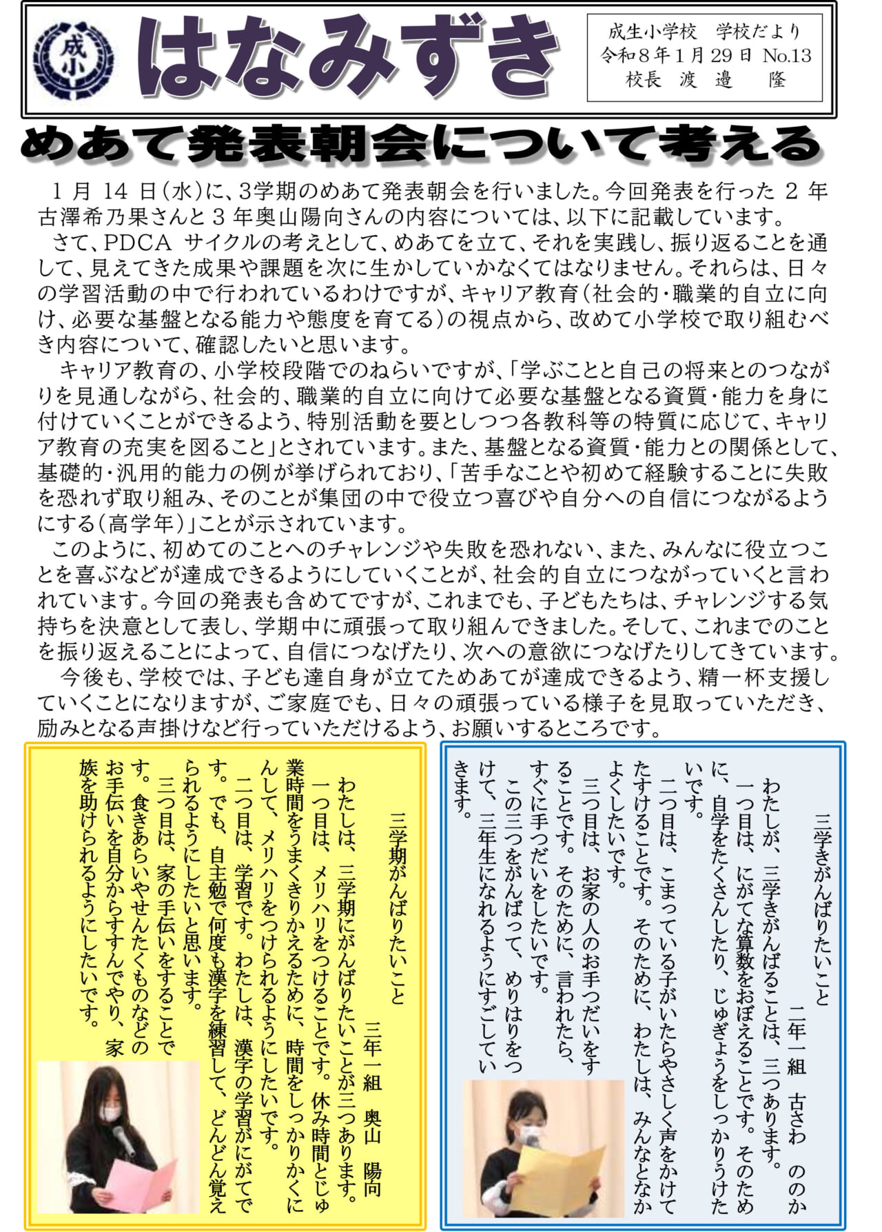 1月14日(水)に、3学期のめあて発表朝会を行いました。今回の代表は、2年生古澤希々果さんと3年生の奥山陽向さんです。希々果さんは、苦手な算数を頑張ること、困っている人がいたら声をかけ、助けること、そして、お家の人のお手 … “3学期めあて発表朝会” の続きを読む
