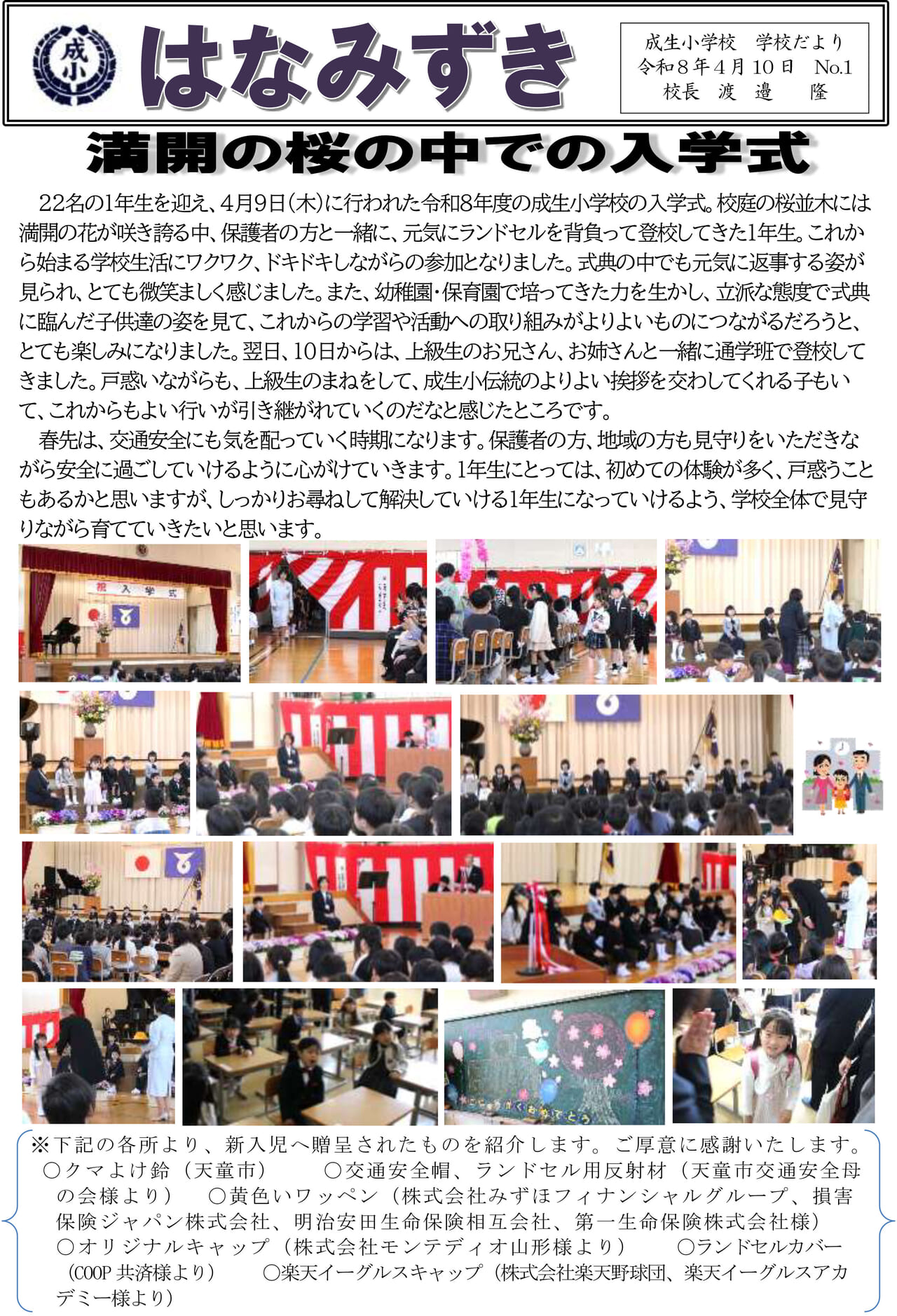 4月8日(水)の新任式・始業式から始まった令和8年度。今日、成生小学校では、4月9日(木)は、新しい1年生を迎える入学式です。新1年生のみなさんは、真新しいランドセルを背負い、嬉しそうな顔を見せながら、お家の方と一緒に登 … “令和8年度入学式” の続きを読む