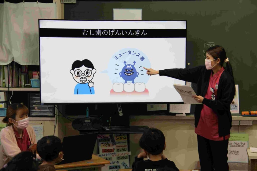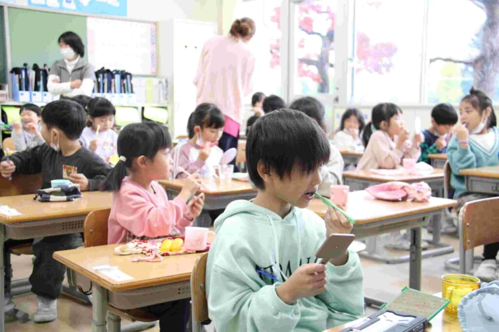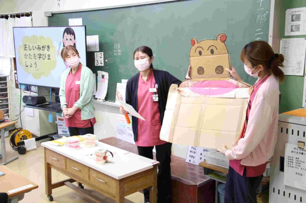 11月21日(金)、本校の学校歯科医でもある今野先生の医院から、3名の歯科衛生士さんを派遣いただき、1年生に向けてブラッシング指導を行いました。歯は命を保つためには大切なものです。いつも食べているおいしい給食をさらにおいしくするためにも、歯を使ってよく噛んで食べることが望まれます。今回は、手作りのカバさんの歯を用いてワンクール法という磨き方を教えていただきました。磨き残しがないように、順序よく右から左へ裏側、そして表側へ歯ブラシを動かしながら取り組みます。また、噛み合わせの部分も忘れずに磨きます。そうすると、磨き残しがなくてきれいな歯を保つことできます。今回、指導いただいたことを生かして、学校でも家庭でもきれいな歯を保ちながら、おいしく食べられる健康な体づくりを目指していきたいと思います。