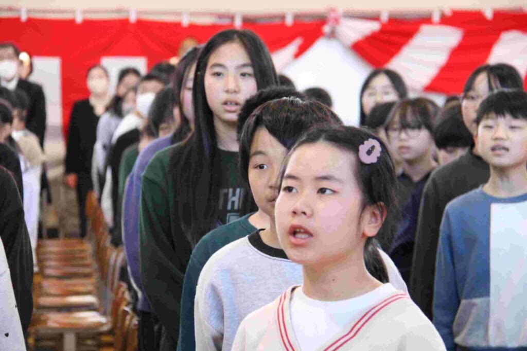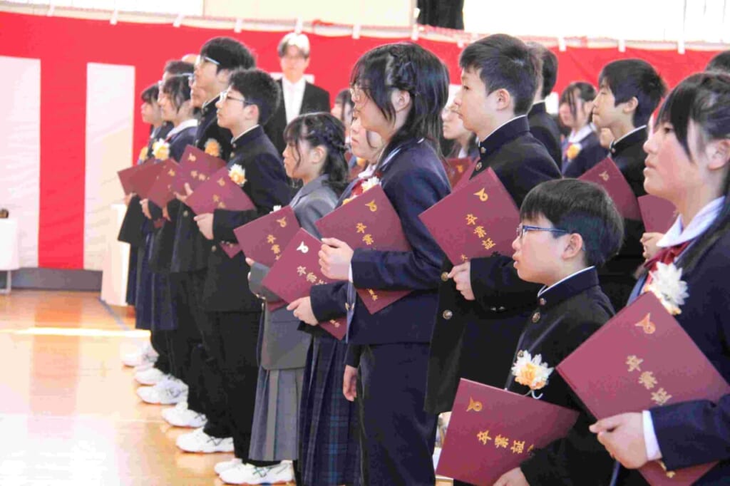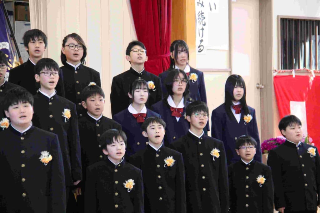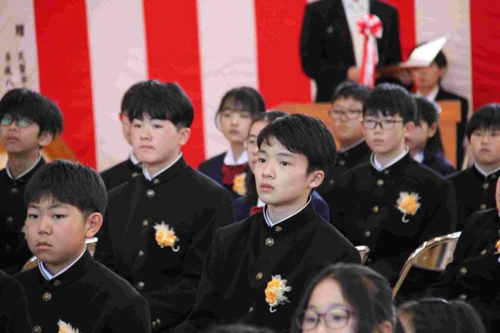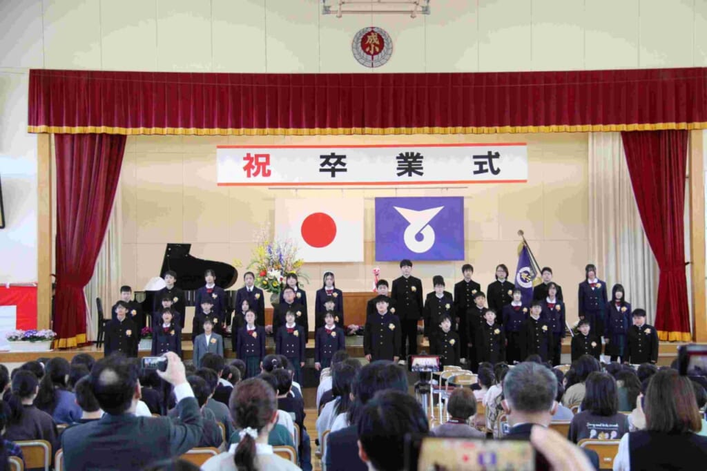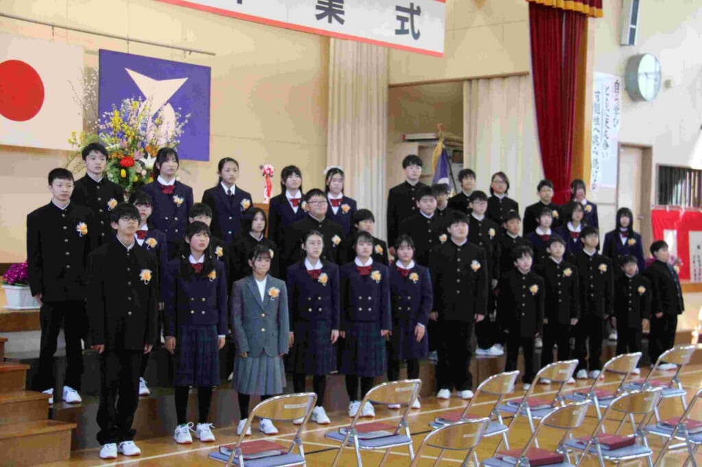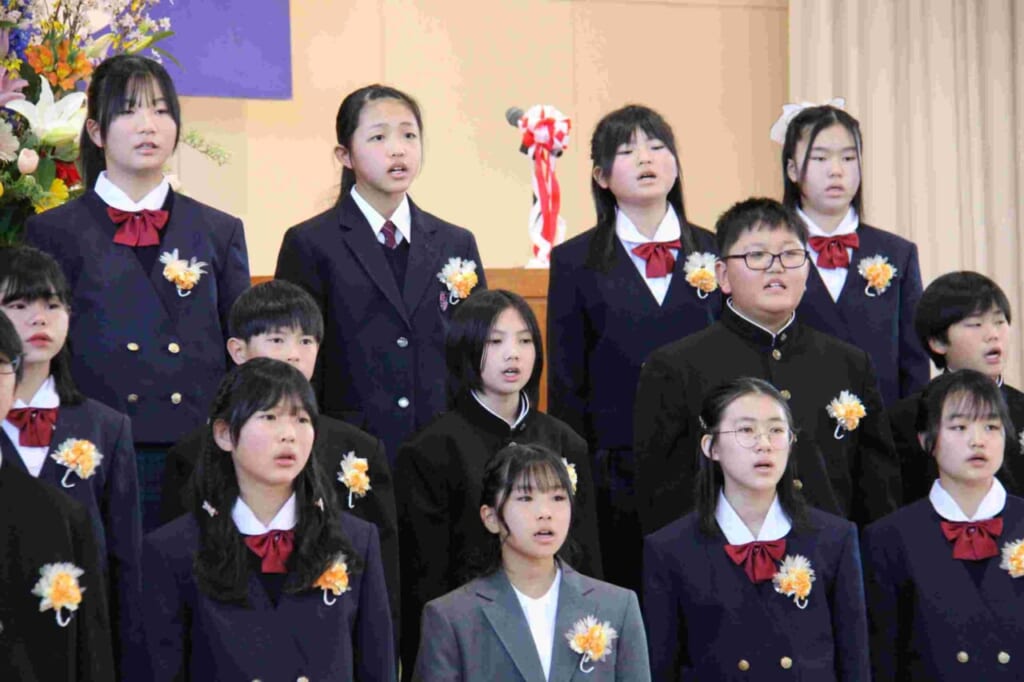 3月20日(金)祝日の日に、成生小学校の卒業式が行われました。予報では雨模様というものもありましたが、当日は葉山や月山まで見渡せるとてもよい天気の中での式典となりました。卒業生の子どもたちは、中学校の真新しい制服を身に着け、これまでとは違う凛々しい表情での会場入場となりました。証書授与の際には、校長先生としっかり目を合わせ、呼名に応じて大きく返事を行い、堂々と受け取っていました。全校合唱や、卒業生の合唱には気持ちがこもり、大きな歌声が講堂に響き渡りました。また、卒業生のみの呼びかけの場面では、声が出なくなった仲間の分も自分が出すという意気込みで、互いに支え合いながら取り組んでいました。また、休む人もなく、全員が卒業証書を手にすることができました。これからは、卒業生一人ひとりが中学校へ向けて希望を抱きながら、歩みを進めていってくれるでしょう。