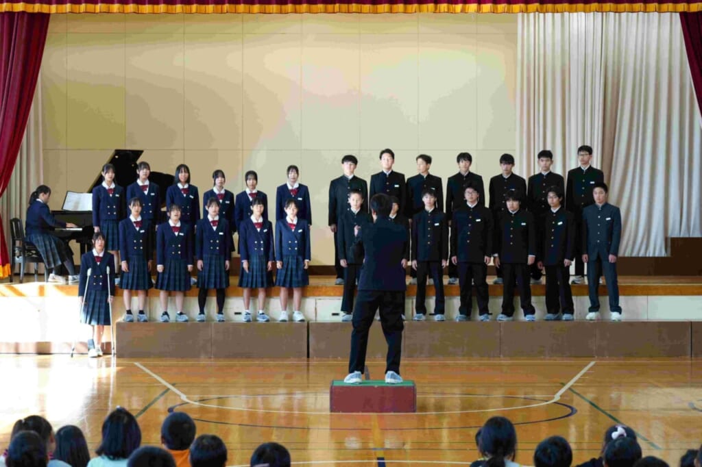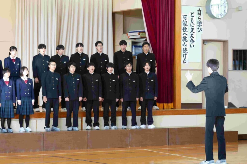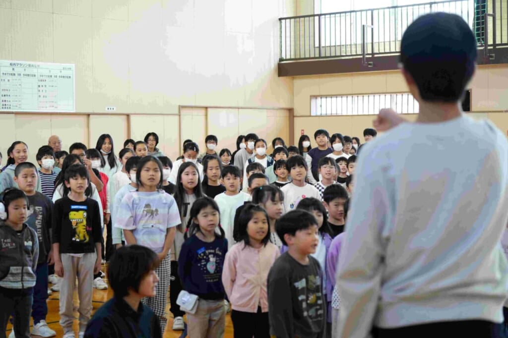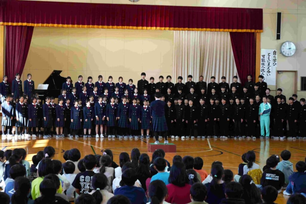 10月24日(金)に、天童四中の2年生と3年生が成生小学校に来校し、子供たちと合唱交流を行いました。これは今年度からはじめた取り組みで、四中生の活躍を地域に広げていく一貫として行われたものです。はじめての試みなので、中学生の自転車置き場や講堂での立ち位置など、事前に打ち合わせを行い、当日を迎えたところです。最初に、成生小学校からこれまで練習してきた「気球にのってどこまでも」を元気よく、精一杯の声で中学生に伝えました。子供たちの歌声に中学生たちも驚いた様子でした。次に、四中生の発表です。まず、2年生全学年での合唱です。成生小の子供たちは、これまで触れたことのない重みのある声と、きれいな高音の響きにびっくりした様子でしたが、その力強さに引き込まれるように聞き入っていました。最後に、3年生の合唱です。クラスごと2つの学級に分かれての発表となりました。2年生とは違い、少ない人数でも一人ひとりが自分のもっている力を存分に発揮し、言葉に気持ちを込めたすがすがしい響きの歌声を披露してくれました。特に、来年中学生になる6年生の人たちの憧れの目で見つめる様子が印象的でした。今回の交流をきっかけにして、改めて学級の歌づくりに取り組んでいきます。これからの子供たちの歌に期待が膨らみます。