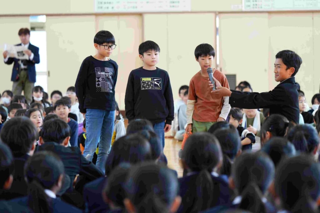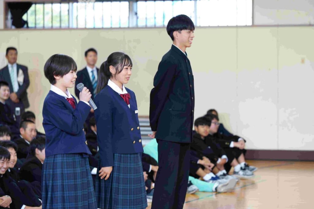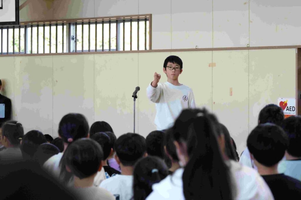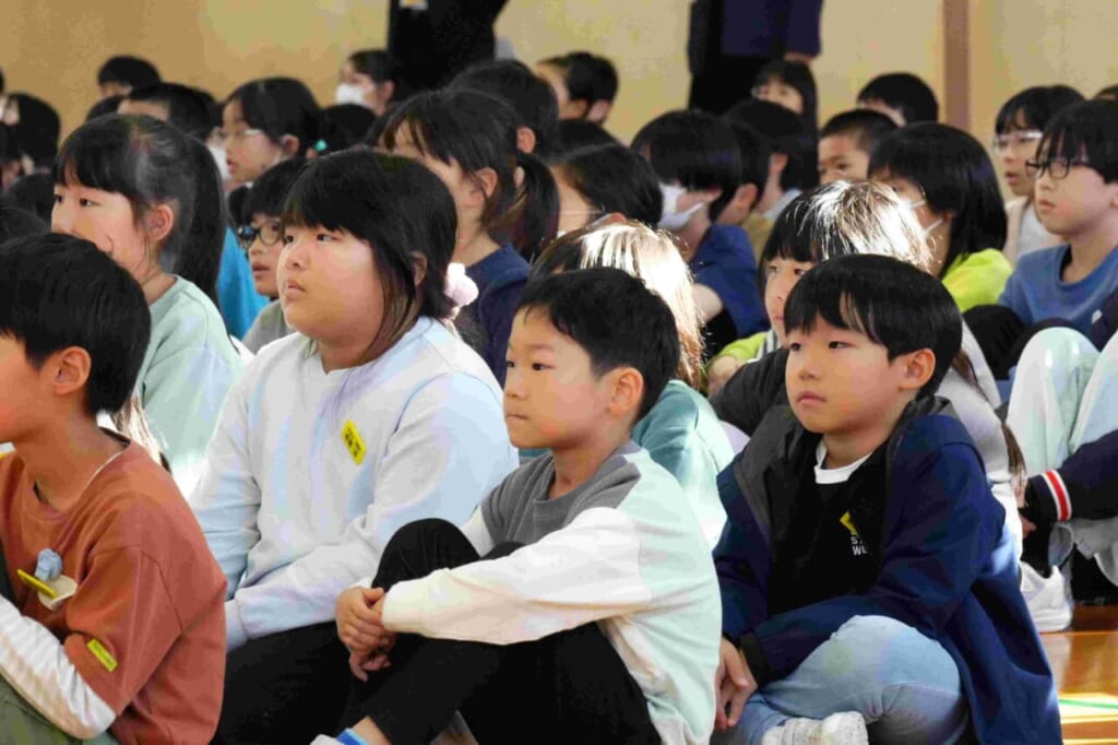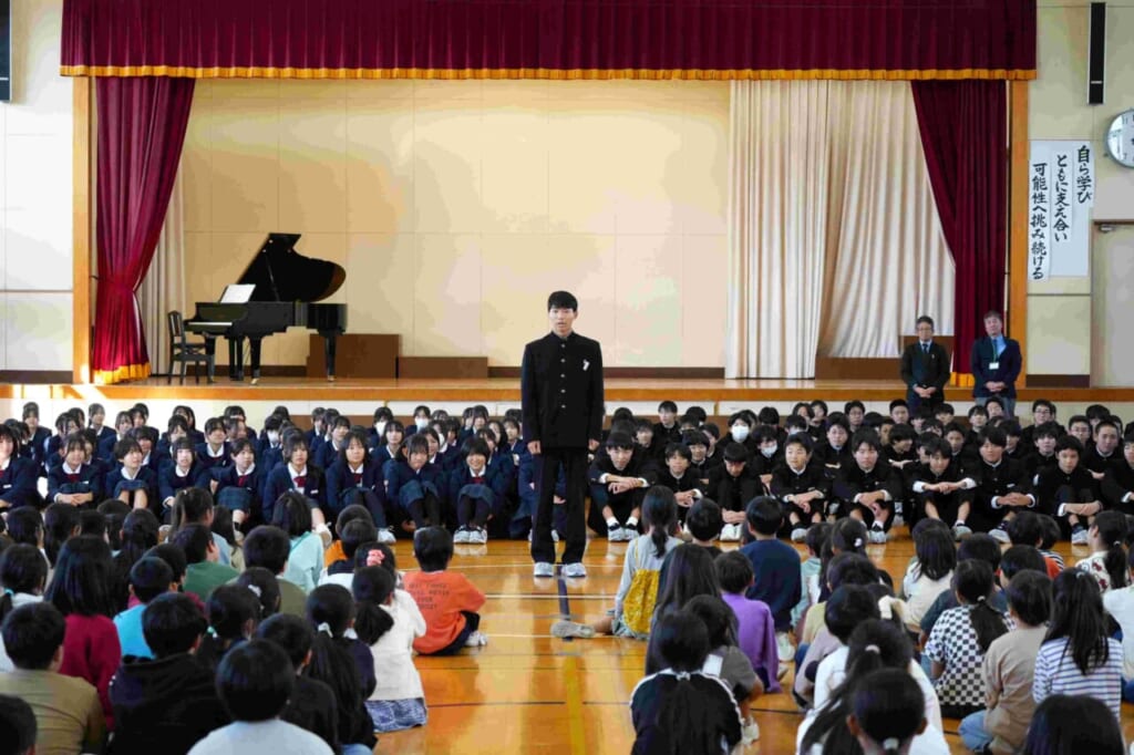 10月24日(金)に、天童四中の2年生と3年生が成生小学校に来校し、子供たちと合唱交流を行いました。これは今年度からはじめた取り組みで、四中生の活躍を地域に広げていく一貫として行われたものです。はじめての試みなので、中学生の自転車置き場や講堂での立ち位置など、事前に打ち合わせを行い、当日を迎えたところです。最初に、成生小学校からこれまで練習してきた「気球にのってどこまでも」を元気よく、精一杯の声で中学生に伝えました。子供たちの歌声に中学生たちも驚いた様子でした。次に、四中生の発表です。まず、2年生全学年での合唱です。成生小の子供たちは、これまで触れたことのない重みのある声と、きれいな高音の響きにびっくりした様子でしたが、その力強さに引き込まれるように聞き入っていました。最後に、3年生の合唱です。クラスごと2つの学級に分かれての発表となりました。2年生とは違い、少ない人数でも一人ひとりが自分のもっている力を存分に発揮し、言葉に気持ちを込めたすがすがしい響きの歌声を披露してくれました。特に、来年中学生になる6年生の人たちの憧れの目で見つめる様子が印象的でした。今回の交流をきっかけにして、改めて学級の歌づくりに取り組んでいきます。これからの子供たちの歌に期待が膨らみます。