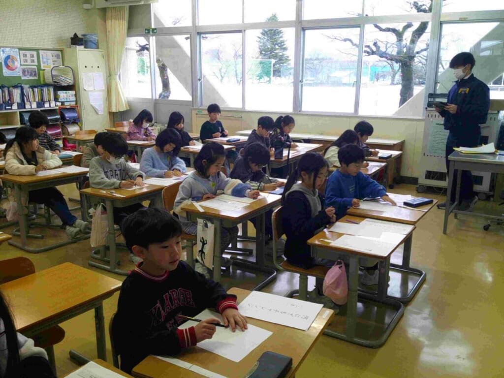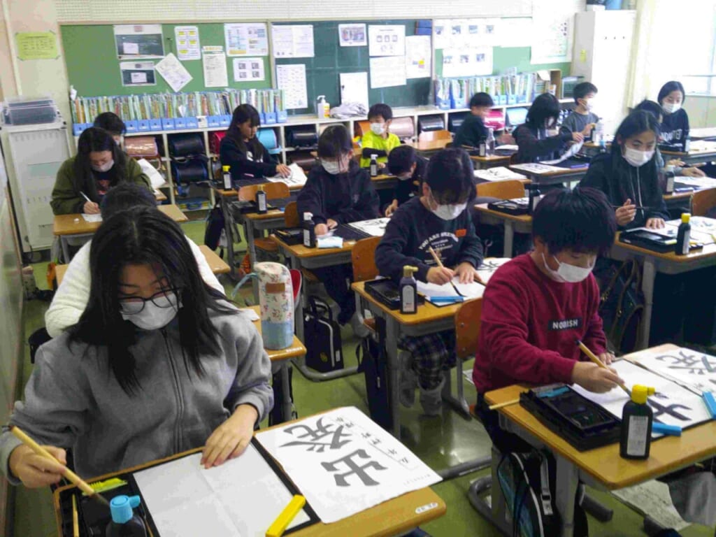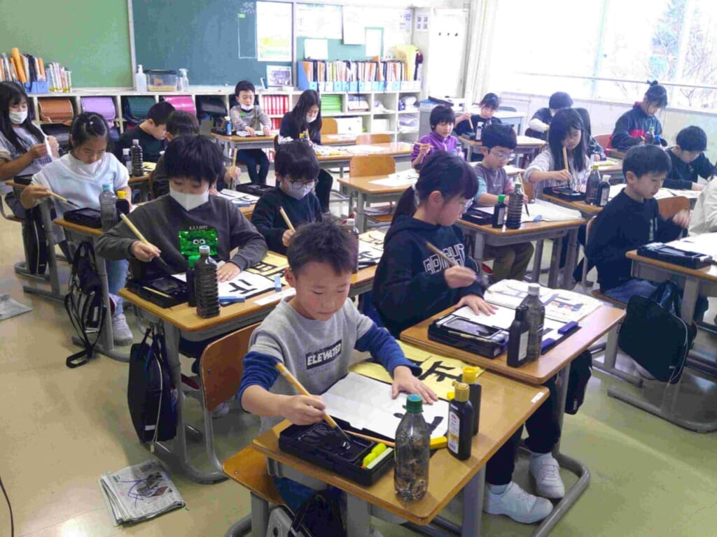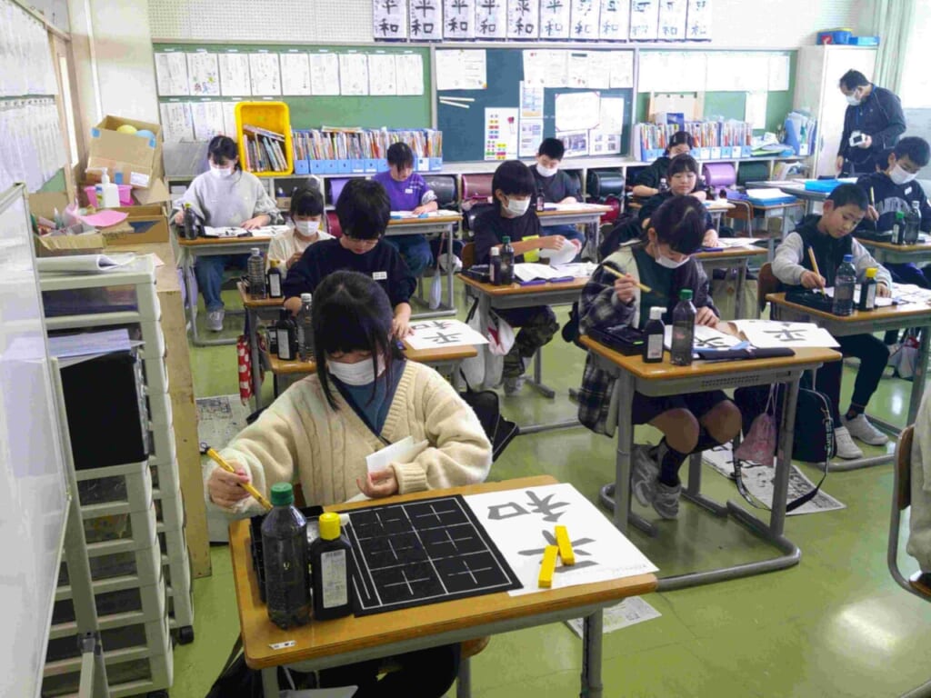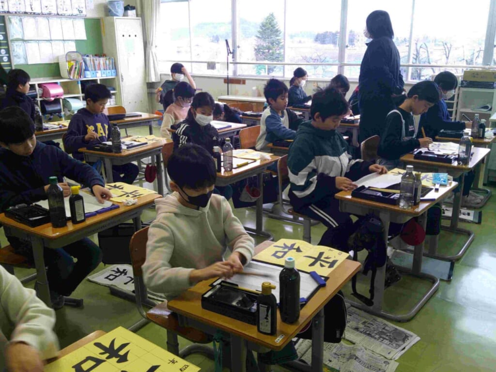 1月8日(木)に書き初め会を行いました。昨年度までは、高学年は講堂において実施していたのですが、今回はすべての学年が教室で行うこととなりました。1年生は鉛筆、2年生はペンで硬筆の清書、3年生以上は毛筆での清書です。書き初めというと毛筆のお手本は長い形の紙に書くのが一般的ですが、今年からこれまでの書写の時間で学んだものに取り組むことにしました。それぞれ、自分の目標を立てて書いた子どもたち。お手本通りに書くことはとても難しいものですが、真剣に、丁寧に取り組んでいる姿が印象的でした。できあがった作品は廊下や教室に掲示して、互いに見合う活動なども行っています。