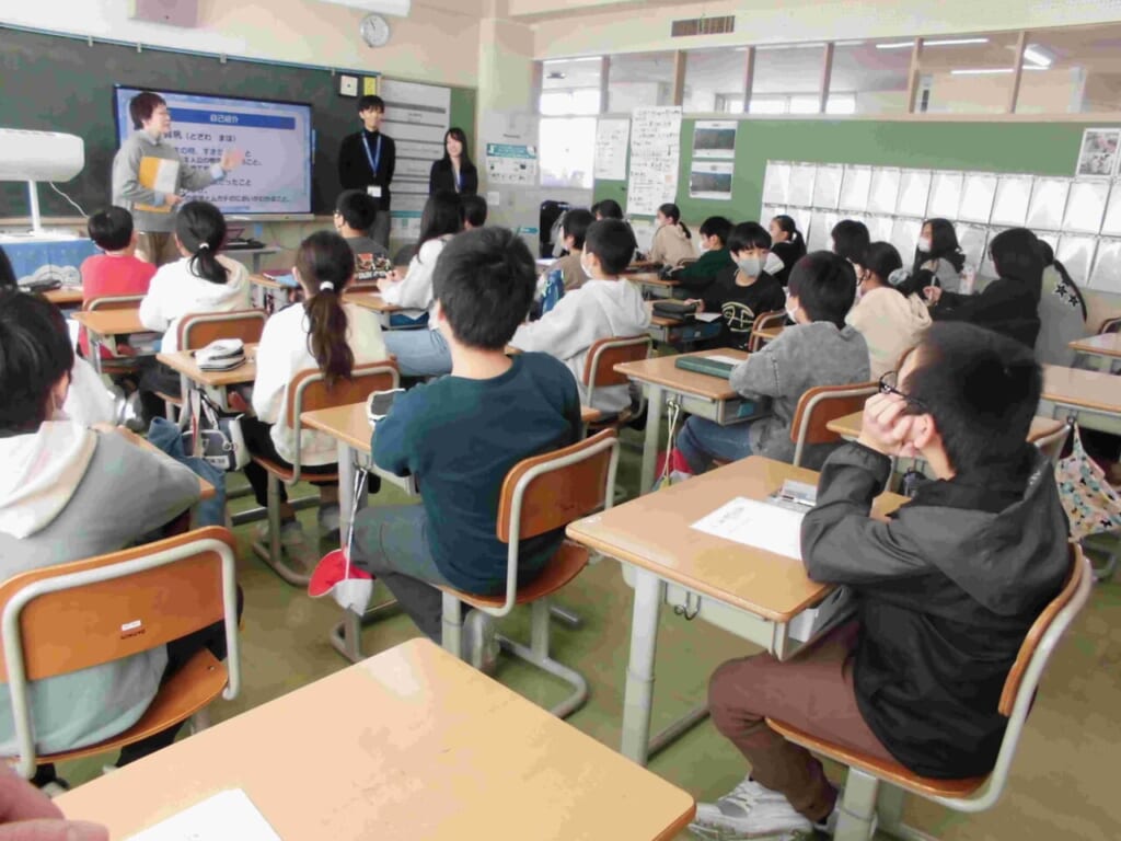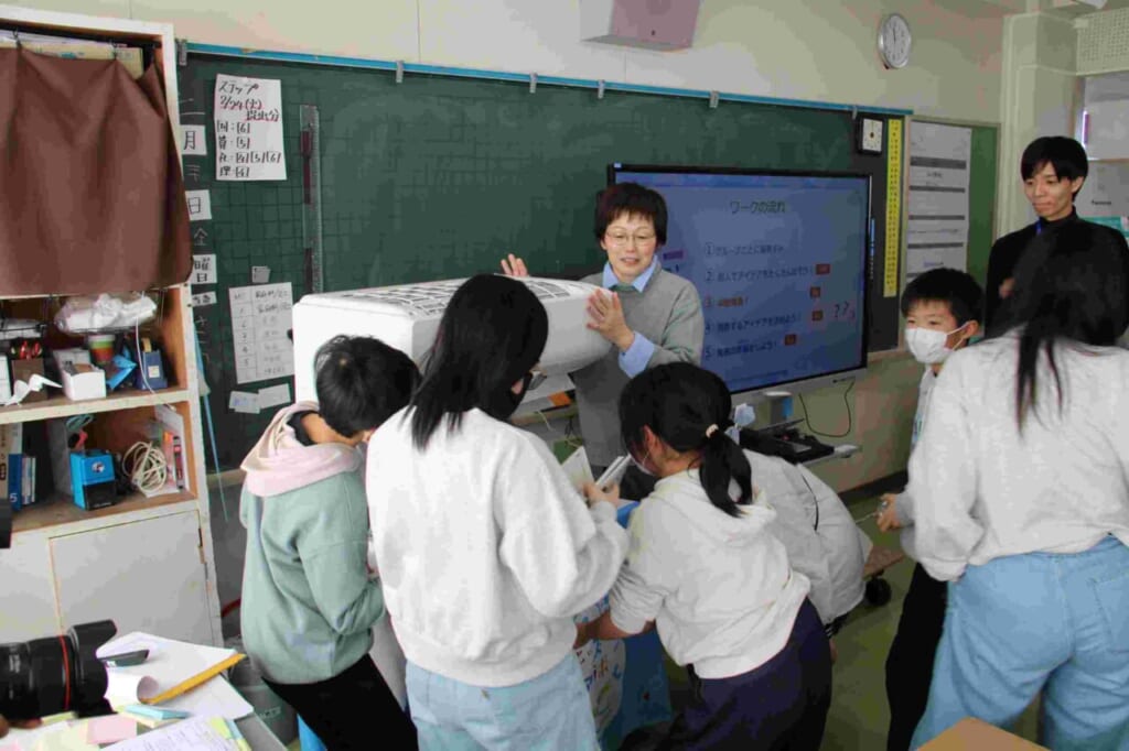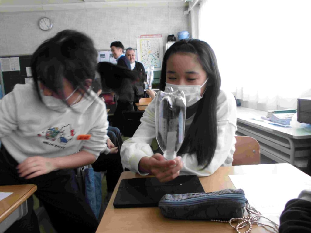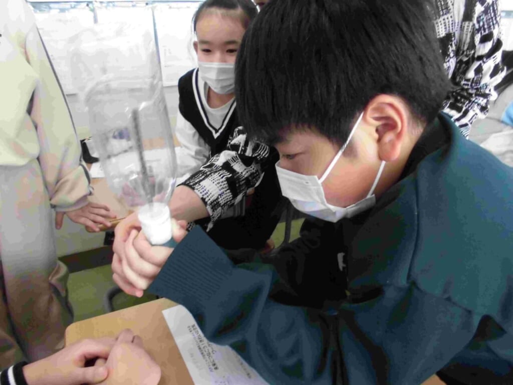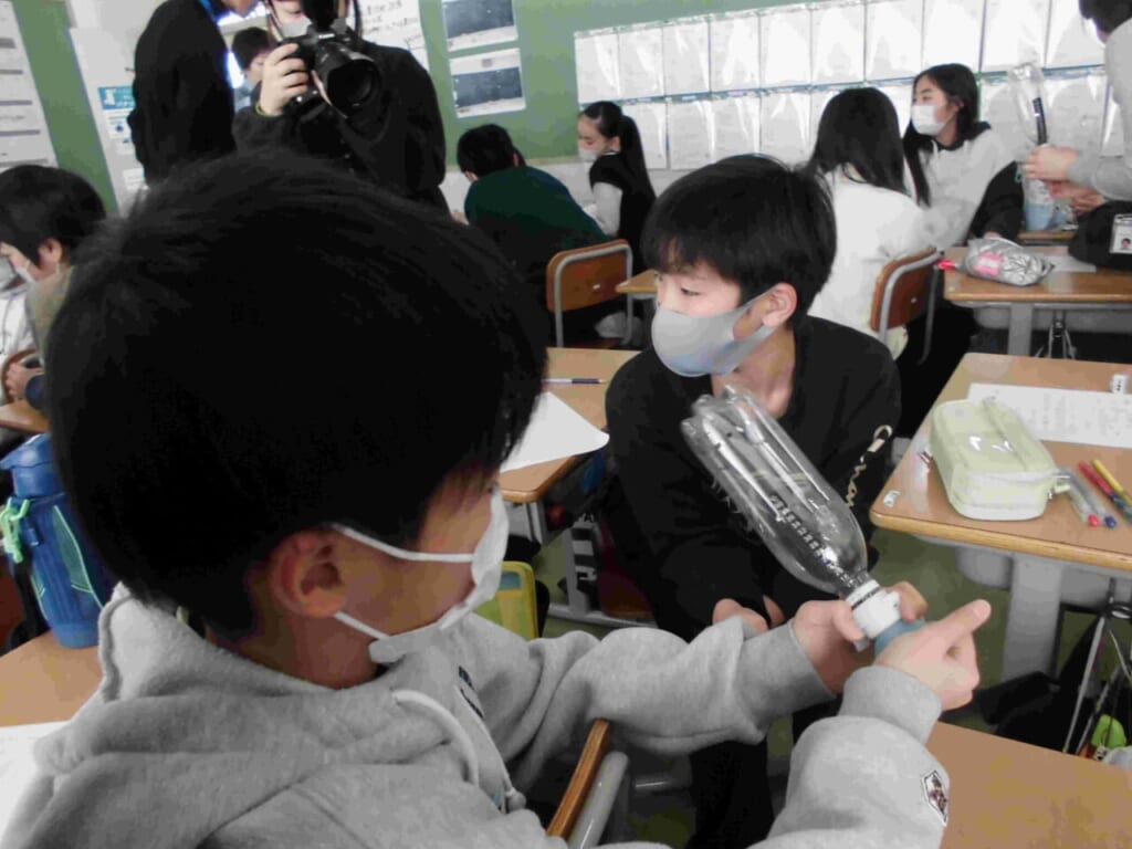 2月20日(金)に、パナソニック空質空調社の方々が来校し、5年生に向けて「空気の授業」を行いました。当日は、遠く東京都や愛知県から16名もの講師等の方々が来てくださり、エアコンの実物やスライド、パネルや実験器具などを用いてエアコンのエコキュートがどのような仕組みで動くのかを伝えてもらいました。実際に、温度がわかるシートをペットボトルの中に入れ、空気を吸いだしていくと中が圧縮され温度が高くなることがわかりました。その原理を応用して石油などの燃料に頼ることなく、空気を温めたり、冷やすことに使ったりすることがわかりました。