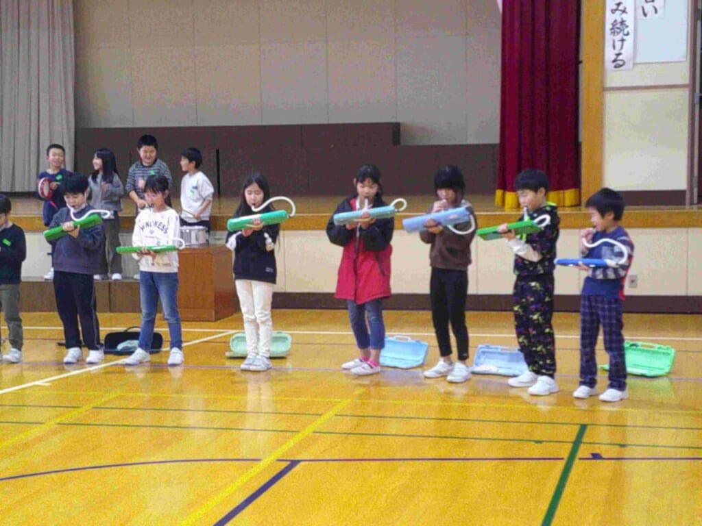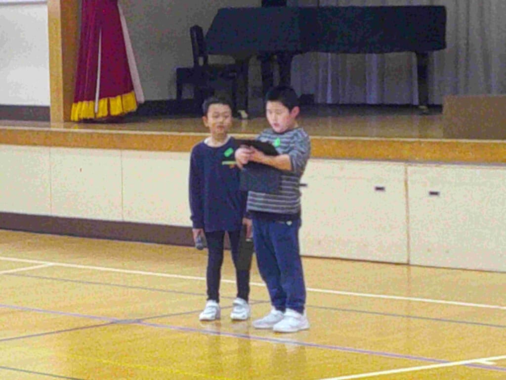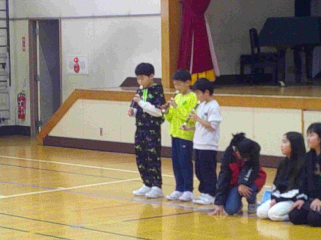12月3日(水)に、3年生の学習発表会がありました。3年生は、これまで学習してきた内容を、それぞれのグループで分担して発表しました。最初は、合奏と合唱です。鍵盤ハーモニカとリコーダーそれぞれのパートに分かれてリズムよくきれいな音を響かせて演奏していました。次は、総合的な学習などで学んだことのまとめです。天童市にある半澤鶏卵さんに興味をもって売れ筋の商品などを紹介していました。また、フルーツの生産が盛んな天童市の様子についてさくらんぼを中心に紹介していました。最後のグループは体育の発表です。まずは、セーフティーマットを使った幅跳びを行ってから、ミニハードルをリズムよく跳び越えた後、マット運動で前転や後転、開脚前転などを披露していました。最後は、全員でミッキーマウスマーチの演奏、気球にのってどこまでもの合唱で締めくくりました。1年生も参観にきてきて、最後の歌のときは一緒に手拍子をして応援していました。保護者の方にもたくさん参加いただき、有意義な時間となったと思います。
